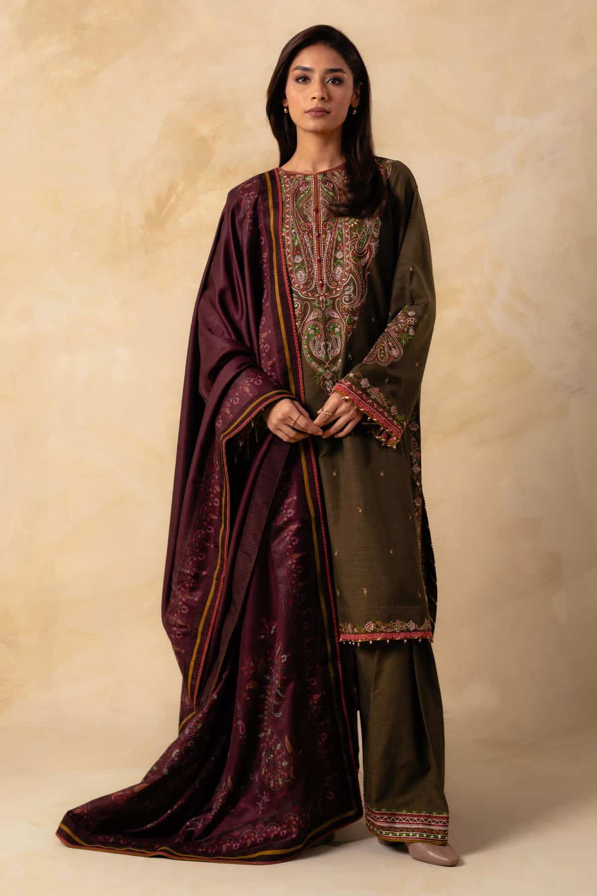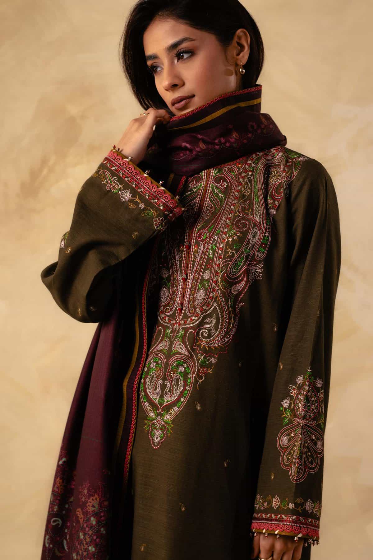 FULLY EMBROIDERED 3PC DHANAK DRESS WITH PRINTED DHANAK SHAWL-ZSJ558