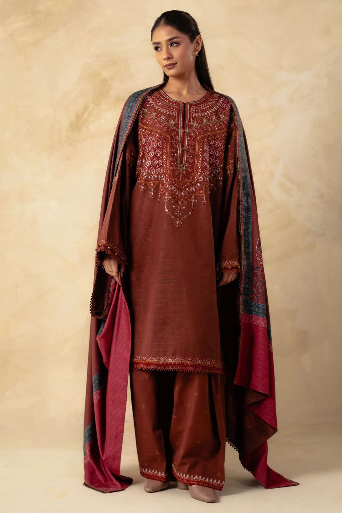 FULLY EMBROIDERED 3PC DHANAK DRESS WITH PRINTED DHANAK SHAWL-ZSJ559
